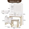 Elevate your daily ritual with this all-in-1 vanity set designed for both style enthusiasts and practical organizers. The centerpiece is a 23" LED-lit mirror offering salon-grade lighting with 3 color temperatures and 7 brightness levels—perfect for achieving natural-looking makeup under any lighting condition. Crafted from durable MDF with reinforced metal frames, this fluted white vanity delivers lasting stability while enhancing your bedroom aesthetic.Storage is maximized through 5 deep drawers with smooth slides, 4 adjustable shelves, and a detachable side cabinet for customizable organization. Securely store hair tools, skincare collections, and jewelry while keeping daily essentials within reach. The included upholstered stool provides cloud-like comfort with its high-resilience foam and breathable fabric, ensuring relaxation during extended grooming sessions.Key Specifications: