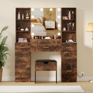 Highlights at a Glance: ample storage with 7 drawers and open shelvesadjustable LED mirror with three color modesbuilt-in charging station for beauty devicescushioned storage stool for comfort and tidinessmodern design with easy assembly