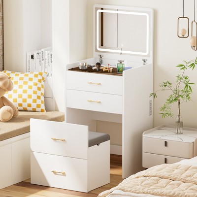 ¡¾3 in 1 design¡¿vanity, nightstand and a smalloffice desk all in one. The vanity table also comes with a flip-up mirror, which flips open to be a luxury vanity and closes to be a nightstand with great storage space, which is a more space-saving design. ¡¾Spacious Storage Space¡¿Equipped with a flip-top jewelry organizer, a hidden storage space(8") for your tall bottle skin product,a drawer,a fluffy bench with a large organizer drawer that holds a large amount of makeup and jewelry,skin care products. ¡¾Vanity Table with Charging Station¡¿- This make up vanity adds an upgraded design with 2 standard plug sockets,a USB port and a Type-C interface, allowing you to sit at your vanity and use your hair dryer or curling iron with the power strip within easy reach. It also provides great convenience for charging mobile phones, tablets, headphones or other mobile devices. ¡¾Glass Desktop¡¿The design of glass visible tabletop allows you to see every cosmetic/jewelry under the desktop at a glance and easily find the cosmetics/jewelry you need. ¡¾Comfortable Cushion¡¿Our matching cushion stool is soft and comfortable, very suitable for ladies to enjoy the makeup/skincare process more. This bench can be placed completely under the table without taking up extra space. ¡¾Customer-oriented service¡¿Our item include detailed instructions and toolkits. We suggest you follow each step in the instructions and then arrange the parts in each step so that you can finish the assembly quickly.