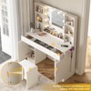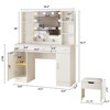 This makeup vanity offers ample storage with 6 open shelves, 3 large drawers, 2 lockers, and hidden bench storage for cosmetics and jewelry. It features a charging station with power outlets and USB ports, a hair dryer shelf, and a large mirror with 10 Hollywood-style LED bulbs in 3 color modes. Measuring 45.2”L×15.4”W×55.7”H with a PU-cushioned stool, it suits bedrooms, salons, and studios. Sturdy design, anti-tip device, and easy assembly with labeled parts included.
