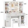 This elegant vanity set features 6 open shelves, 3 makeup trays, 4 large drawers, and 2 side cabinets, offering ample space for cosmetics, jewelry, and styling tools. The large mirror is equipped with 10 Hollywood-style bulbs in 3 color modes (warm yellow, warm white, cold white) for adjustable makeup lighting. Measuring 45.2”L×15.4”W×55.7”H with a PU-cushioned stool (hidden storage), it doubles as a home office desk. Anti-tip safety device included. Easy assembly with labeled parts.
