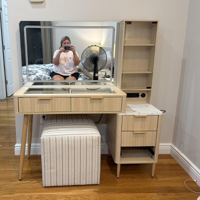 Makeup Vanity Desk with Lights, Fluted Wooden Dressing Table with 5 Drawers and Adjustable Shelves, Makeup Vanity Table Glass Top for Bedroom, Oak
