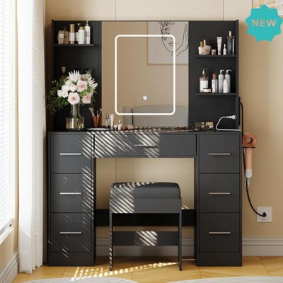 - Elegant and Functional Vanity Set with Built-In Mirror and Chair Create a luxurious beauty space with this vanity desk, featuring a large mirror, bright touch LED lights, and a comfortable cushioned chair for daily grooming.