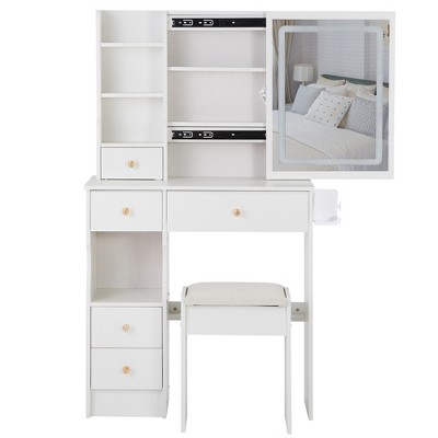 Makeup Vanity Desk with Mirror and Lights, Small Makeup Table Set with Drawers & Cabinet, Dressing Table with Stool & Power Outlet for Bedroom