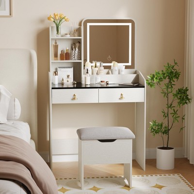 Makeup Vanity Set with Mirror and Lights, Modern Vanity Set with Hidden Storage Stool, 2 Large Drawers, 3-Tier Open Shelves, for Bedroom