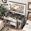 This farmhouse-style makeup desk set features a classic silhouette with 4cm thick PU upholstery, ideal for designer bedrooms. It includes a built-in power outlet with 2 AC sockets and USB ports, letting you use hair tools conveniently while seated on the soft stool. The oversized mirror has 10 3-color LED bulbs, perfect for various makeup needs. With 3 drawers and 2 cabinets (each with 2 removable panels), storage is highly adjustable. Its unique tempered glass desktop reveals drawer items for easy access, adding charm. Easy to assemble with instructions; contact us for any issues.