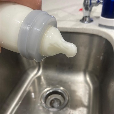 A: Hi there,We recommend gently running your finger over the ventilation hole on the rim of the nipple to open before assembling the nipple into the top screw ring. This will prevent air from entering the bottle. Be sure that when you pull the nipple through you hear a “click” sound. Thank you for your question!