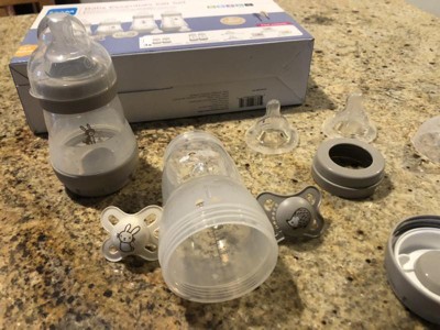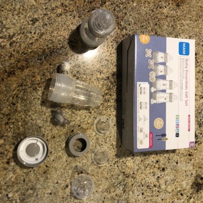 The MAM Newborn Essentials "Baby Essentials" Set - everything new parents and growing babies need. At MAM we work with medical experts to anticipate your baby boy or baby girl’s needs from day one. This set includes three 5 oz anti-colic bottles with slow flow nipples, two 9 oz anti-colic bottles with medium flow nipples, one extra slow flow bottle nipple, one fast flow bottle nipple, one Start Newborn pacifier, one 0-6 month pacifier and one 6+ month pacifier.. The pacifiers, specially designed in 3 different sizes to grow with your baby, have an orthodontic SkinSoft nipple that feels natural and supports jaw development. Whether you’re using baby formula or expressed breast milk, MAM bottles will support you every step of the way. Our Easy Start Self-Sterilizing Anti-Colic Bottle is the perfect fit for newborns, specially designed to minimize colic symptoms while feeding. The innovative vented base allows for an even drinking flow, helping to reduce colic for 80%* of babies. Each MAM Anti-Colic Bottle is self-sterilizing, making them suitable for feeding your baby when you don’t have a bottle sterilizer on hand. Simply add water and pop in the microwave for three minutes. The bottle is made from BPS and BPA free materials and the removable bottom makes clean-up a snap. Perfect for your registry or baby shower! Dishwasher safe. *Field study, Austria 2011, tested with 73 mothers of colicky babies / Market research, USA 2010, tested with 35 mothers of colicky babies.