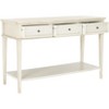 Simple lines and purity of function lend a timeless quality to the Shaker inspired Manelin console with tapered legs, three drawers and lower shelf. Crafted of solid wood and MDF, this console is at home in country, rustic or transitional settings.