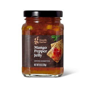Bring a unique flavor sensation to your snack assortment or liven up your morning toast with this Mango Pepper Jelly from Good & Gather™. This tasty spread boasts a sweet flavor plus a touch of heat, for a taste that perfectly complements a variety of appetizer offerings. Enjoy it on crackers combined with an assortment of cured meats and cheeses. The unique flavor makes a beautiful addition to your charcuterie board when entertaining, and this mango pepper jelly is made with no high fructose corn syrup.