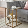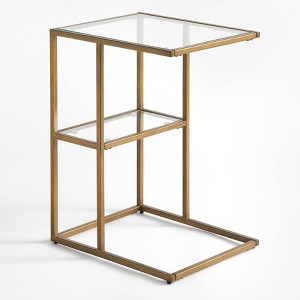 Balance your space with modern design and function with the Manhattan C Table from Buylateral. The unique C-shape design enables you to slide the leg easily underneath your sofa or chair. Ideal for working on your laptop or eating while watching your favorite TV show. Constructed of metal with a brush gold tone finish and durable tempered glass upper and lower shelves.