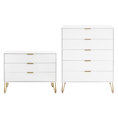 Manhattan Comfort Dumbo 3pc 5 Drawer Dresser, 3 Drawer Dresser and Nightstand Set White/Gray