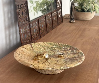 Absolutely love this! Actually used it as a dresser piece for my jewelry. Each piece is actually different, and I found one piece in store that had tinges of green in it (the others didn’t). Think it’s better personally for a coffee table or dresser/nightstand rather than “fruit bowl” as advertised