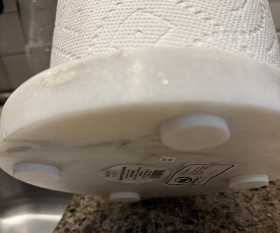 I’m used to cheap paper towel holders that slide all over the counter and become mobile when you yank off a paper towel - not this one! The heavy marble base keeps her in one place, even when paper towels are pulled off!! And she’s a beauty! Worth every penny.