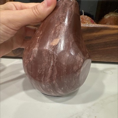 This pear was reasonably priced, arrived quickly and came wrapped wonderfully to avoid breakage. I placed it with 2 pumpkins I bought in the same order but will use on its own when fall is over. It’s a great size, weighty and a soft, muted color red. The flat-ish dimensions to part of the side add to its authenticity; the sides are mostly rounded, not flat.