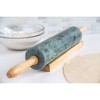 Enjoy baking cookies or rolling out your own pizza dough with the family? Then bring some ease to your baking with this Green Marble Rolling Pin! The rolling pin is 10" long, has nylon ball bearings for a smooth rolling, wooden handles for easy grip, and a wooden base for rest. The marble helps keep the dough cool while rolling, and its natural non-stick properties keep dough from clinging. Even the toughest doughs are flattened easily and effortlessly. Let the smoothness and heft of this rolling pin do the hard work for you!