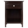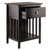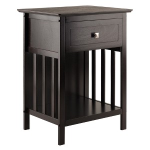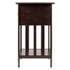 The Marcel Accent Table includes eye-catching details such as Mission-style slatted sides, a full-sized drawer, and step-cut hardware. Use this all-around end table in the living room next to the sofa, as a bedside table, or a printer stand in your home office. The lower shelf is ideal for keeping books and magazines, and the ample drawer is great for storing TV remotes and charging wires out of sight, yet within easy reach. Made of Solid and Composite Wood in a dark Coffee finish.