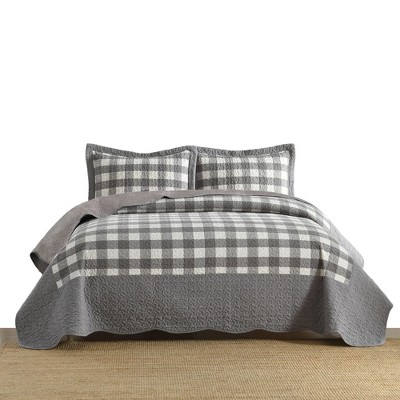 Marcielo 3 Pcs Quilted Bedspread Set In Grey And White Checkered Pattern