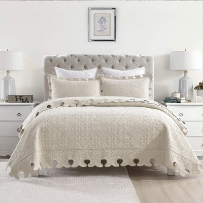 This exquisite 3 - piece bedspread ensemble is meticulously fashioned from 100% cotton, boasting an oversized silhouette. The set features an intricately quilted texture that exudes elegance, complemented by charming scalloped edges. It seamlessly marries comfort and refined style, poised to elevate the ambiance of any bedroom.