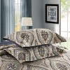 This bedding set features a neutral - toned, intricate paisley pattern. It includes a quilt and matching pillow shams, creating a cohesive and stylish look. The set is complemented by a dark headboard, bedside lamps, and light - colored walls, enhancing the room's cozy and elegant ambiance.