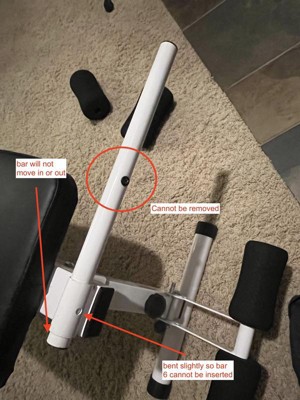 I ordered a Marcy Pro Deluxe flat folding bench. PM 507 It is defective in two ways 1. The Screw in the upper leg bar was pre screwed, and to insert the bar into the into the table it needs to be removed. It cannot be removed, the screw is starting to strip as I’ve tried so hard to open it. 2. The slot the bar should be inserted into is slightly bent making it near impossible to insert the bar. I have inserted it by about 1 inch, and it will no longer move in or out. See attached photo. With force it may be removed, but it may break further.