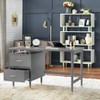 Timelessness design is accentuated with the Margo Desk from Buylateral. Mid-century modern inspired, this desk features a tailored profile, showcasing a raised desktop with 2 spacious drawers for all your office essentials. Constructed of MDF, pine wood and gold tone handles with matching capped solid wood legs for added stability. The charcoal gray finish will add vintage flair to your home office, creating an eye-catching focal point in any room décor.