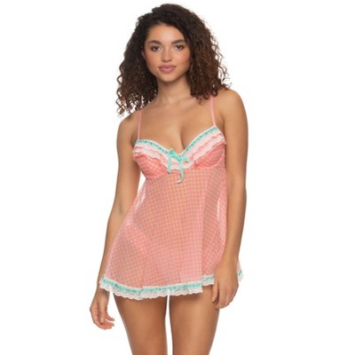 You'll feel so cute and sexy in this timeless and playful strapless point d'esprit babydoll. Contour cups, light boning, and underwire offer support, while a soft mesh skirt floats away from the body from the waist. Classic point d'esprit is a great way to elevate a simple mesh, and is currently hard to find! The cherry on top? A soft, delicate mesh ruffle trim tips the top cup edge and matching g-string waist. Fabric Content: 87% Nylon, 13% Spandex Mesh (G-String & Liner): 85% Nylon, 15% Elastane Care Instructions: Wash before wearing. Hand wash cold separately. Do not bleach. Do not twist or wring. Reshape. Lay flat to dry. Do not iron. Do not dry clean.