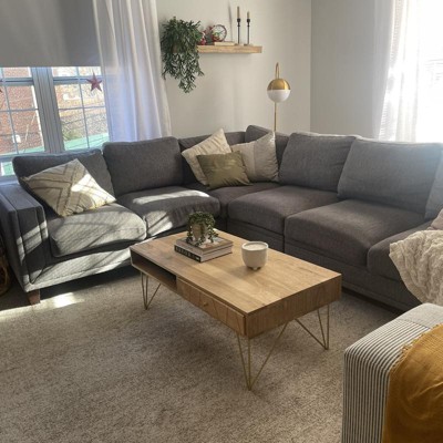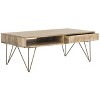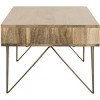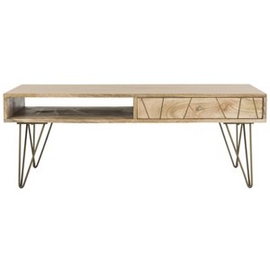 This Marigold Coffee Table brings decorative drama to any room with its retro inspired design and chic artisan details. Geometric hairpin legs in a sleek brass finish beautifully pair with the matching inlay on Marigold's slim drawer, perfectly offsetting its smooth natural mango wood and open middle shelf. Care Instructions: Dust regularly with a soft, dry cloth. Never use oiled or treated cloths on lacquered finishes. Some finishes can be wiped with a damp (not wet) cloth, followed at once by rubbing with a dry cloth to remove fingerprints and smudges. For persistent spots, gently clean with a soft cloth and a solution of water and mild soap, make sure to wipe dry. Use adhesive felt pads, coasters and placemats to protect your furniture.