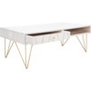 This Marigold Coffee Table brings decorative drama to any room with its retro inspired design and chic artisan details. Geometric hairpin legs in a sleek metal finish beautifully pair with the matching inlay on Marigold's slim drawer, perfectly offsetting its smooth whitewash wood and open middle shelf. Care Instructions: Dust regularly with a soft, dry cloth. Never use oiled or treated cloths on lacquered finishes. Some finishes can be wiped with a damp (not wet) cloth, followed at once by rubbing with a dry cloth to remove fingerprints and smudges. For persistent spots, gently clean with a soft cloth and a solution of water and mild soap, make sure to wipe dry. Use adhesive felt pads, coasters and placemats to protect your furniture.