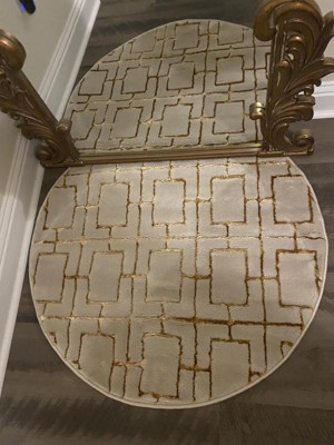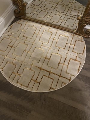 This is a beautiful gold and white glam rug. It has a couple of lines in it from being rolled up, but those will disappear after a while. It is very smooth to the touch and quite affordable for the size, 3 x 3 round.