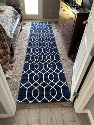 The rug is a beautiful deep, rich blue color with white accents. It is very soft to the touch and has a good weight and backing. I am very pleased with my purchase.