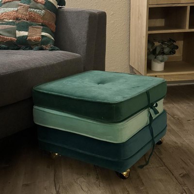 I purchased this ottoman to go with a dark green velvet sofa. It is absolutely perfect for my design intention. I was stunned when I saw it while just browsing the site, I had to put in an out of stock notification & was so happy it came back in. There are a couple minor issues with it, none of the wheels lock how they’re supposed to, which is odd, but I have it on thick carpet so it doesn’t slide around too much. & yes, the scratches & lines don’t seem to rub out but I knew that going in thanks to another review but I’m fine with that. It’s a low grade velvet material but it is still velvet so it holds up to cat claws, no snagging, just the lines. They do seem to think it is their own personal tuffet, but it is perfectly sized for them, so what can I say. Also, I thought the cushions could be color arranged to your liking, but that’s not entirely the case either, bc of the way the string ties are & the bottom cushion is attached to the base, but that’s ok. I still love it.