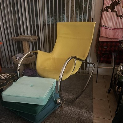 Sturdy, adjustable height, has casters so it’s each to move. Cushions are firm and remove to adjust height. You can use them as floor cushions when you want to sit on the floor. Cons: I wish cushions were sold separately. I wish the third cusion came off the base.(it doesn’t, you can remove the top two) I like the light blue, but it’s too much of a contrast with the other two cushions. They are going for a gradient, I just would prefer sold. It’s also jarring against the yellow chair I got this for. Cat approved.