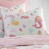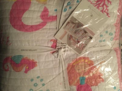 The Marina Reversible Quilt Set by Levtex Home is inspired by bedtime stories of mermaids. Offered in pink, blue, gold, and white, this design will immediately transform your kid's bedroom. This reversible quilt features a tossed pattern of colorful mermaids, seahorses, fish and coral on the front, reversing to a simple pink and white dotted pattern on the back. The quilt and sham have a cotton front and back, filled with a cotton-rich filler, and are machine washable. Your kid will surely enjoy this for years to come!