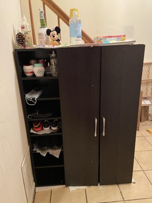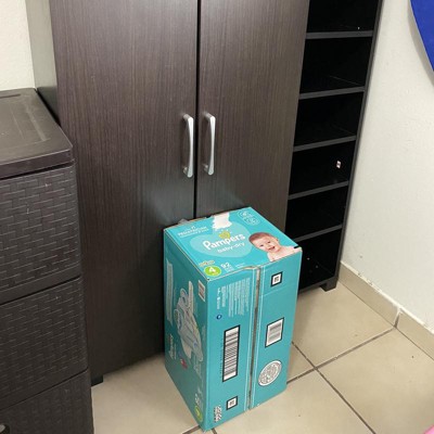 Stylish and compact, the Marine cabinet is the solution to efficient shoe storage. Constructed from engineered wood, the Marine showcases an elegant wenge finish. Two doors conceal six shelves with storage space for up to 12 pairs of shoes. Additional shoe storage is provided by seven open shelves. Circular cut-outs on the back of the cabinet enable air circulation and prevent mold growth on your shoes. Silver PVC door handles and PVC legs complete the look. The Marine cabinet is made in Malaysia and requires assembly.