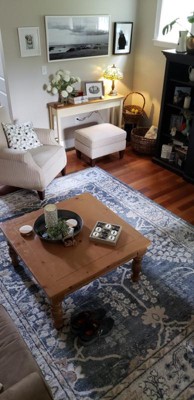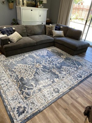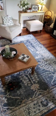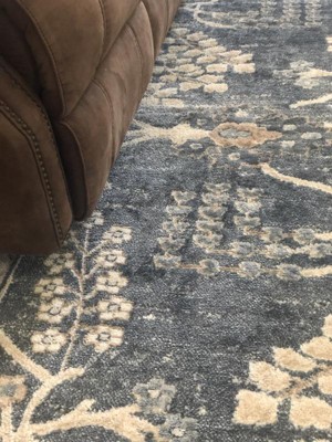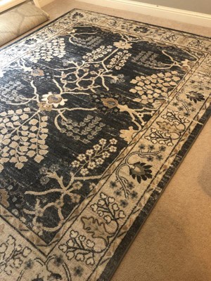 LOVE the design of this rug! It is more blue in person than the pics show, which I was pleasantly surprised by. It’s more of a smoky navy than gray. The only drawbacks are that the rug is quite thin and the back is rough, so a rug pad is necessary on a hardwood floor to help with both issues. All in all, would purchase again!