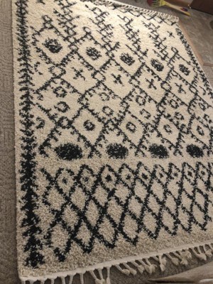 The rug came in and it was such a hit. I love the little tassels, since it gives it some flare. I have a mix of mid century, boho, and south western going on in my living room, and I believe it ties it together. I have had manny compliments on it too. My dogs are pretty obsessed with it too. They rub their backs on it, and lay on it all the time. It is very soft and doesn't sit up high. When i laid it out there was no issues with any of the ends sticking up. It lays flat to the carpet ground without any issues. My friends toddler came over and loved crawling all over it. I would very much recommend this rug. Shipping was fast too.
