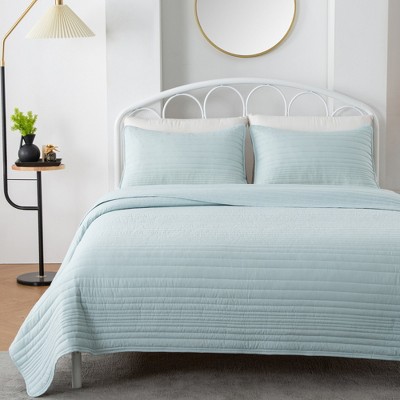 Add casual comfort with a modern flair to your home with this beautiful Sofia Collection Reversible Striped Quilt Set by Market & Place. Crafted with a soft and breathable microfiber exterior and cotton/polyester fill, this quilt set keeps you cozy and comfortable all year long. It's classic light blue and off-white striped design with a simple striped pattern on the reverse side is the perfect accent to the top of your bed. This quilt set is machine washable for easy care and long lasting use. Each quilt set comes with one quilt and two shams (one sham for Twin size). Choose from three sizes: Twin: 1 Quilt (90" x 66"), 1 Standard Sham (20" x 26"), Queen: 1 Quilt (90" x 90"), 2 Standard Shams (20" x 26"), King: 1 Quilt (90" x 108"), 2 King Shams (20" x 36")