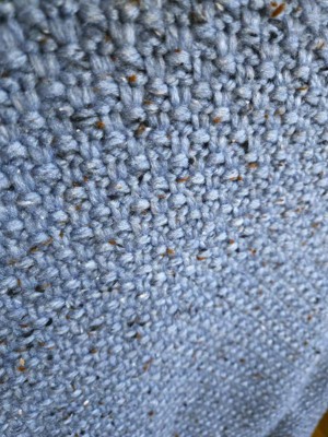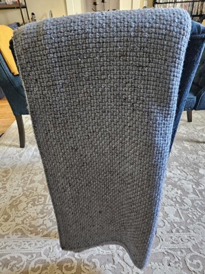 Marbled Knit Throw in Blue by Threshold. 50x60 Pro: Very soft and warm. Easy to clean with a damp towel. Con: Feels slick, and smooth to the touch much like polyester. If you don't mind the smooth feel it's a warm and soft throw.