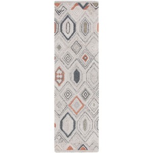Featuring a distinctive pattern captured in the image, this runner rug displays an array of geometric shapes that create a dynamic and engaging look. The hand-tufted technique used in its creation adds to the rug's textured feel and artistic appeal.