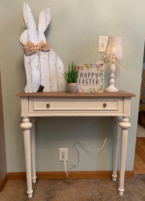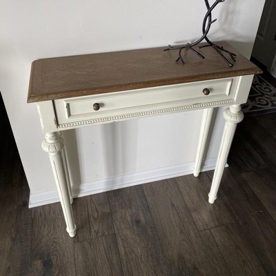 A lot of defects in the paint. I know it’s supposed to have a weathered look, but this is definite paint problems. Very disappointed for a table that expensive. Oh, when you put it together Pull the drawer out otherwise it’s almost impossible to reach the Allen wrench in there.
