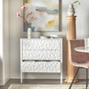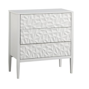 Bring unique style into your living space with the Marquise Modern Accent Cabinet from Buylateral. This cabinet features a dimensional pattern on the drawer fronts. The geometric angles add interest making it an ideal accent piece with various storage opportunities for your living room, family area or entryway. The generously sized drawers make it perfect for stowing away a variety of items. Hidden magnetic open/close feature (no drawer hardware) easily operates with a slight push to open and close. Constructed of durable MDF and solid pine wood legs in a crisp white finish.