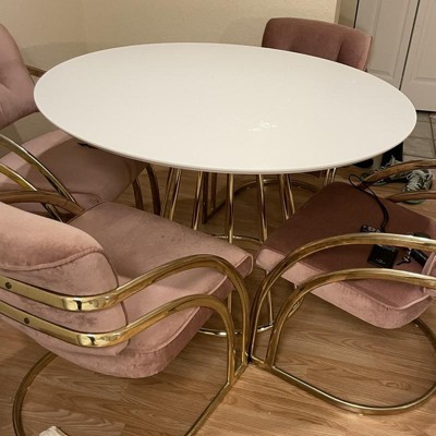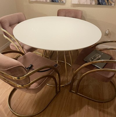 Create visual interest in any dining area or kitchen space with the Marsai Round Dining Table from Buylateral. This table is a striking complement to any contemporary room interior with its defining gold-tone finished metal base. With its sleek white table top at 43.3 inches wide, this table offers spacious comfortable conversational seating for up to four individuals. Improved tabletop and base construction for greater stability.