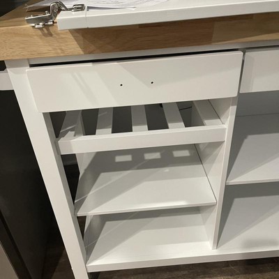 Add a classic touch to your kitchen with this Martha Kitchen Cart from Buylateral. This cart features two drawers, three open shelves, and a cabinet with two shelves inside, allowing for ample amounts of storage space. Wheels lock allowing this cart to stay in place, but also to move easily when needed. This cart in a white finish with a natural top coordinates perfectly with almost any interior. Dimensions: 41.5 x 17.75 x 36 inches.