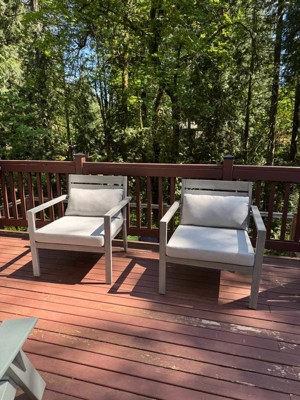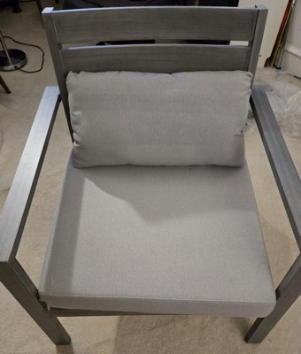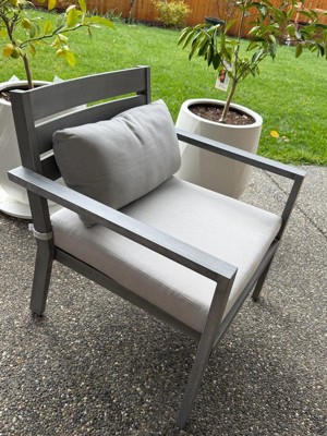 [This review was collected as part of a promotion.] I really love the look of these Martha Stewart gray patio chairs—the gray brushed woodgrain finish is so nice and modern, and the aluminum frame feels really solid and sturdy. They definitely give off a high-quality, polished vibe that makes my patio look put together. That said, I have to be honest: they’re not the most comfortable to sit in for long periods. The back pillow is tiny, so it doesn’t give much support, and after a while, I found myself adjusting constantly to get comfortable. They’re perfect if you want something stylish and durable, but I’d probably add my own cushion if I planned to sit for a long time.