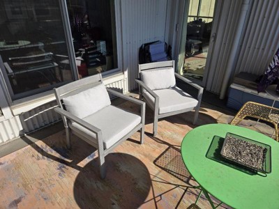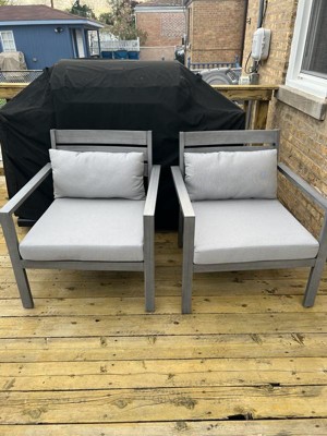 [This review was collected as part of a promotion.] These are great! The aluminum matches the industrial aesthetic of our balcony so well. They were easy to assemble with the included Allen wrench - my husband did it in about 20 minutes (honestly I think it took longer to remove all the pieces from the packaging). My only complaint is I would prefer a way to attach the top pillows to the chair.