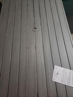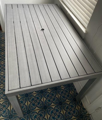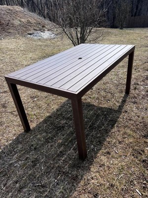 [This review was collected as part of a promotion.] I’m happy with this 60” table. I’ll be using it outside on my deck. I like how much room the table has, it can seat up to 6 people. It also has the hole in the middle for the umbrella. It arrived in a large box but was lighter than expected and easy to assemble. One person can do it. I like the gray color and the material feels durable. It has the look of wood grain but the feel of aluminum. I’m excited to use it this summer and have more room to eat outside.