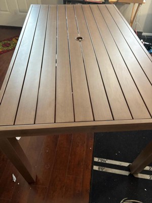 Elevate your indoor-outdoor sanctuary with the Martha Stewart Bedford Patio Table. Masterfully crafted with a beautiful hand-brushed woodgrain finish, this table seats six and lends elegance to any occasion. All-weather materials deliver peace of mind to pair with your morning coffee or a favorite novel. An umbrella hole makes it easy to complement this indoor-outdoor dining table with your preferred patio umbrella (not included). Part of our Bedford collection, this indoor-outdoor table pairs wonderfully with the coordinating armchairs, armless chairs, and bar stools, perfect for crafting a custom collection that fits your entertaining needs. Setup is simple with tools included and step-by-step instructions and only minimal maintenance is required, making this patio table a must have for everyday use as well as special occasions.