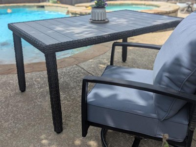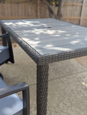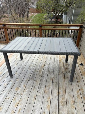 [This review was collected as part of a promotion.] Absolutely love this patio table! It looks sleek and modern, and the rattan wicker base adds a beautiful texture. The engineered wood top feels sturdy and holds up well both indoors and outdoors. It’s the perfect size for gatherings and super easy to clean. Great quality from Martha Stewart, as always!