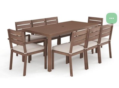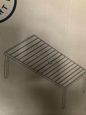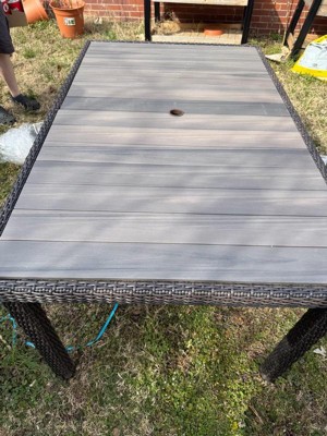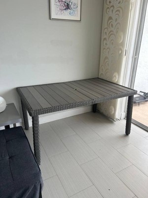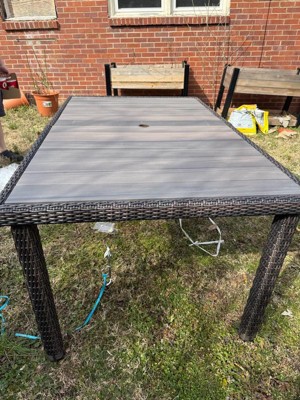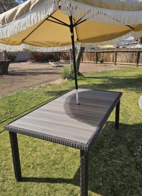 [This review was collected as part of a promotion.] Elegant indoor-outdoor dining table that elevates any patio into a sanctuary of alfresco style All-weather aluminum frame with a hand-brushed woodgrain finish lends rustic beauty Umbrella hole (umbrella not included) Pair with other pieces in this patio collection for a custom arrangement to fit your hosting needs Maximum static weight capacity: 200 lbs. Simple setup takes just 30 minutes with step-by-step instructions Use a damp cloth to wipe clean